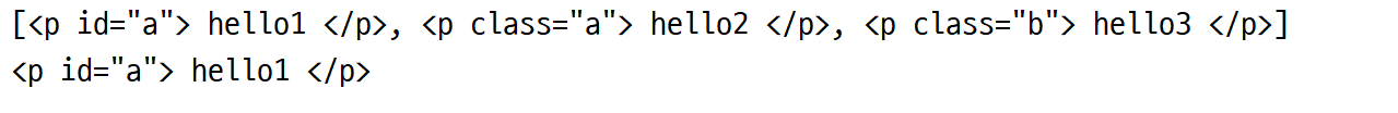 from bs4 import BeautifulSoup html = '''<html> <head><title>test title</title></head> <body><p id="a"> hello1 </p><p class="a"> hello2 </p><p class="b"> hello3 </p></body> </html>''' soup = BeautifulSoup(html, 'lxml')