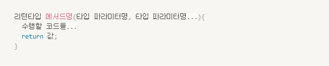 • 리턴타입 : 메서드 안 작업을 수행하고 나온 결과의 데이터타입 (리턴해주는 값의 데이터타입)