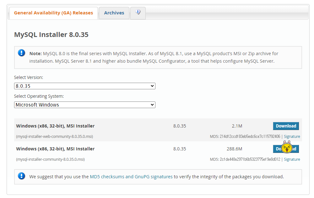 Note: MySQL 8.0 is the final series with MySQL Installer. As of MySQL 8.1, use a MySQL product's MSI or Zip archive for installation. MySQL Server 8.1 and higher also bundle MySQL Configurator, a tool that helps configure MySQL Server.