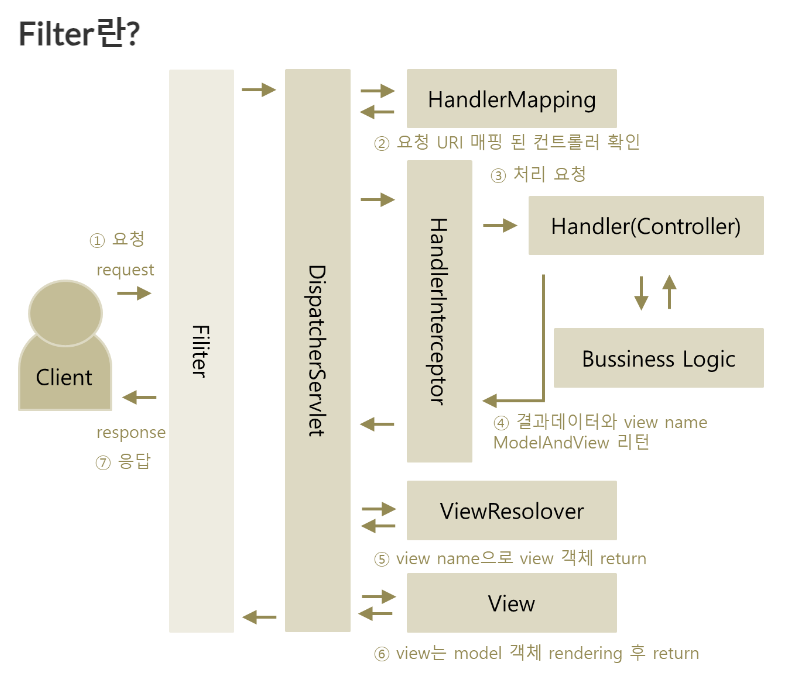 필터란? 거른다는 뜻이다. 서블릿의 ServletContext 기능으로 사용자에 의해 서블릿이 호출 되긴 전/후로 사용자 요청/응답의 헤더 정보 등을 검사 및 설정할 수가 있다.
