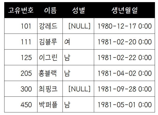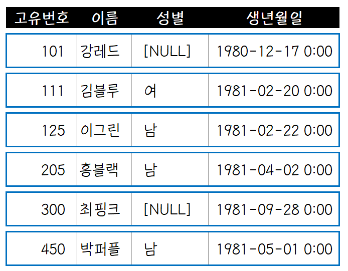 맨윗줄 고유번호, 이름, 성별, 생년월일 이것을 컬럼(column) 이라고 한다.