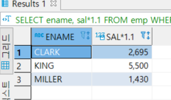 Ex) emp 테이블의 ename과 sal칼럼 데이터에 1.1곱하여 출력
