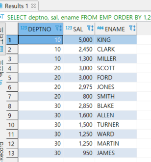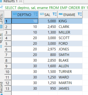 ORDER BY deptno ASC, sal DESC; -- 첫번째 정렬하고 그안에서 두번째 기준으로 정렬함