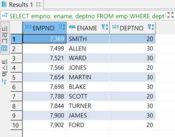 Ex) deptno 칼럼에 값이 20 또는 30과 일치하는 데이터의 empno,ename,deptno을 조회하기
