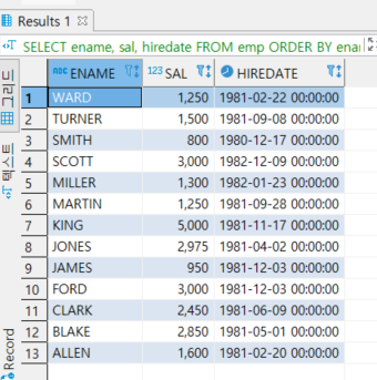 SELECT ename FROM emp ORDER BY ename; -- 오름차순 정렬