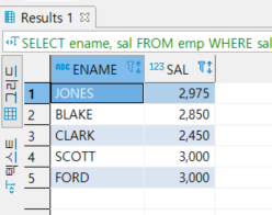 Ex) sal 칼럼에서 2000~3000의 값을 가지고 있는 데이터의 ename, sal 조회하기