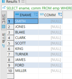 Ex) comm 칼럼에 값이 없는 데이터의 ename,comm를 조회한다