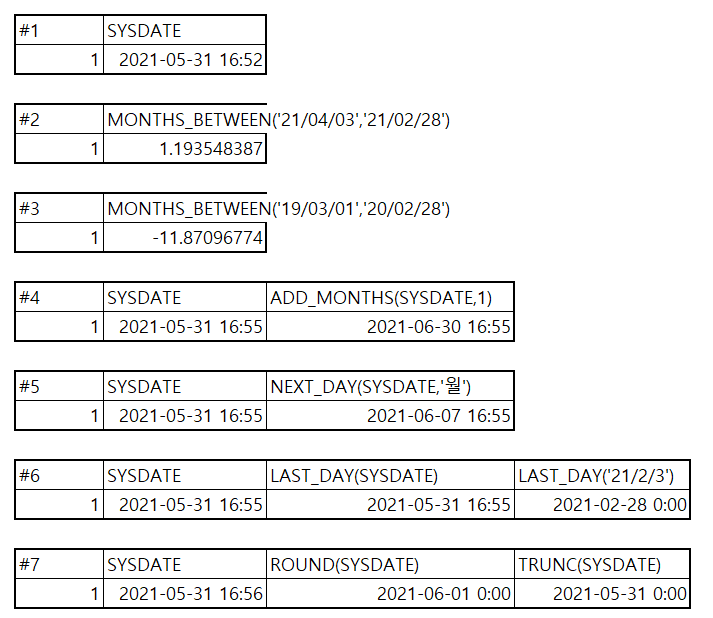 SELECT SYSDATE, ADD_MONTHS(SYSDATE, 1) FROM DUAL; --#4