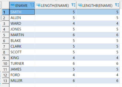 SELECT ENAME, LENGTH(ENAME), LENGTHB(ENAME)