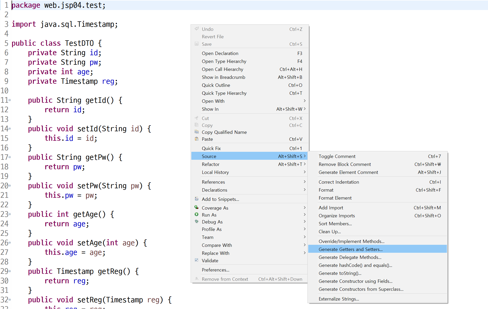 화면에서 마우스 우클릭 -> Source -> Generate Getters and Setters... 클릭 단축키ver. Alt + Shift + S -> Generate Getters and Setters... 클릭 Generate Getters and Setters 창이 뜨면 원하는 속성을 클릭하고 Generate 하면 짜잔하고 만들어진다. Select All : 전체선택 Deselect All : 전체해제 Select Getters : Getter 만 선택 Select Setters : Setter 만 선택 변수에 따라 선택하여 만들고 싶으면 직접 클릭하여 생성하면 됨 변수명 맨앞에 꺽새를 누르면 이렇게 get메소드, set메소드가 뜸, 원하는것 클릭클릭해서 메소드 만들기 접근지정자도 선택이 가능..